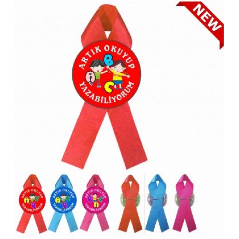 1 Sınıf artık okuyorum abc yaka rozeti kurdaleli Kırmızı 2 cm kurdale den fiyonk şeklinde ortası 44 mm metal rozet  olup, arkası iğnelidir.